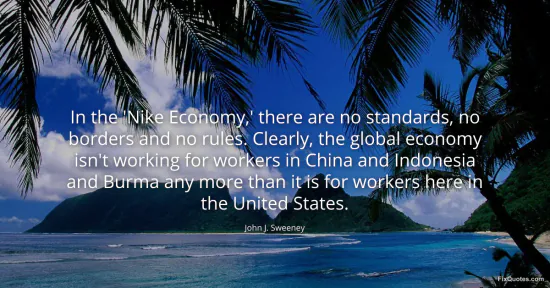 Sweeney, John J. (2026, January 16). In the 'Nike Economy,' there are no standards, no borders and no rules. Clearly, the global economy isn't working for workers in China and Indonesia and Burma any more than it is for workers here in the United States. FixQuotes. https://fixquotes.com/quotes/in-the-nike-economy-there-are-no-standards-no-119637/