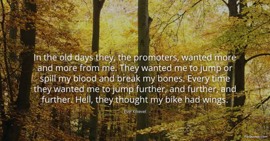 Knievel, Evel. "In the old days they, the promoters, wanted more and more from me. They wanted me to jump or spill my blood and break my bones. Every time they wanted me to jump further, and further, and further. Hell, they thought my bike had wings." FixQuotes. January 17, 2026. https://fixquotes.com/quotes/in-the-old-days-they-the-promoters-wanted-more-52752/.