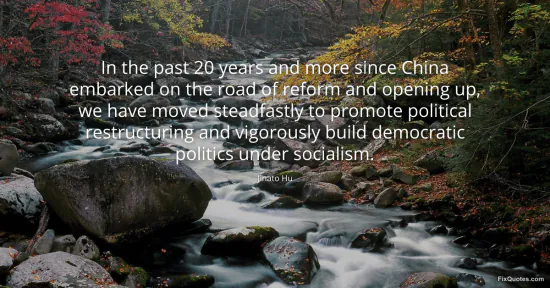 Hu, Jinato. "In the past 20 years and more since China embarked on the road of reform and opening up, we have moved steadfastly to promote political restructuring and vigorously build democratic politics under socialism." FixQuotes. January 17, 2026. https://fixquotes.com/quotes/in-the-past-20-years-and-more-since-china-56240/.