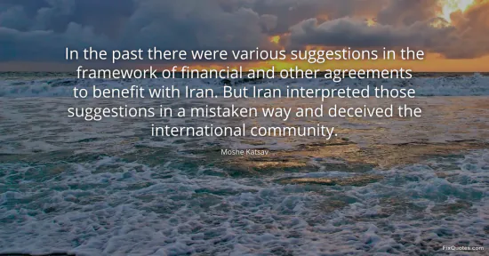 Katsav, Moshe. (2026, January 17). In the past there were various suggestions in the framework of financial and other agreements to benefit with Iran. But Iran interpreted those suggestions in a mistaken way and deceived the international community. FixQuotes. https://fixquotes.com/quotes/in-the-past-there-were-various-suggestions-in-the-82224/