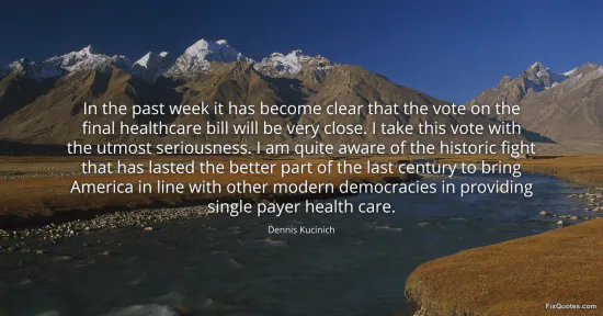 Kucinich, Dennis. "In the past week it has become clear that the vote on the final healthcare bill will be very close. I take this vote with the utmost seriousness. I am quite aware of the historic fight that has lasted the better part of the last century to bring America in line with other modern democracies in providing single payer health care." FixQuotes. January 17, 2026. https://fixquotes.com/quotes/in-the-past-week-it-has-become-clear-that-the-56653/.