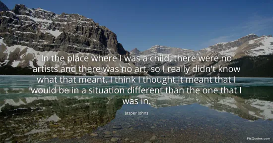 Johns, Jasper. "In the place where I was a child, there were no artists and there was no art, so I really didn't know what that meant. I think I thought it meant that I would be in a situation different than the one that I was in." FixQuotes. January 15, 2026. https://fixquotes.com/quotes/in-the-place-where-i-was-a-child-there-were-no-143023/.