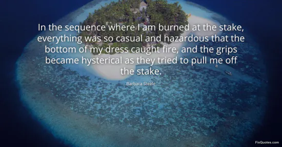 Steele, Barbara. "In the sequence where I am burned at the stake, everything was so casual and hazardous that the bottom of my dress caught fire, and the grips became hysterical as they tried to pull me off the stake." FixQuotes. January 17, 2026. https://fixquotes.com/quotes/in-the-sequence-where-i-am-burned-at-the-stake-40314/.