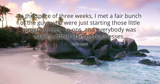 Dyson, Esther. (2026, January 17). In the space of three weeks, I met a fair bunch of the guys who were just starting those little programmers' co-ops, and everybody was talking about starting businesses. FixQuotes. https://fixquotes.com/quotes/in-the-space-of-three-weeks-i-met-a-fair-bunch-of-66690/