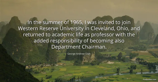 Olah, George Andrew. "In the summer of 1965, I was invited to join Western Reserve University in Cleveland, Ohio, and returned to academic life as professor with the added responsibility of becoming also Department Chairman." FixQuotes. February 16, 2026. https://fixquotes.com/quotes/in-the-summer-of-1965-i-was-invited-to-join-154443/.