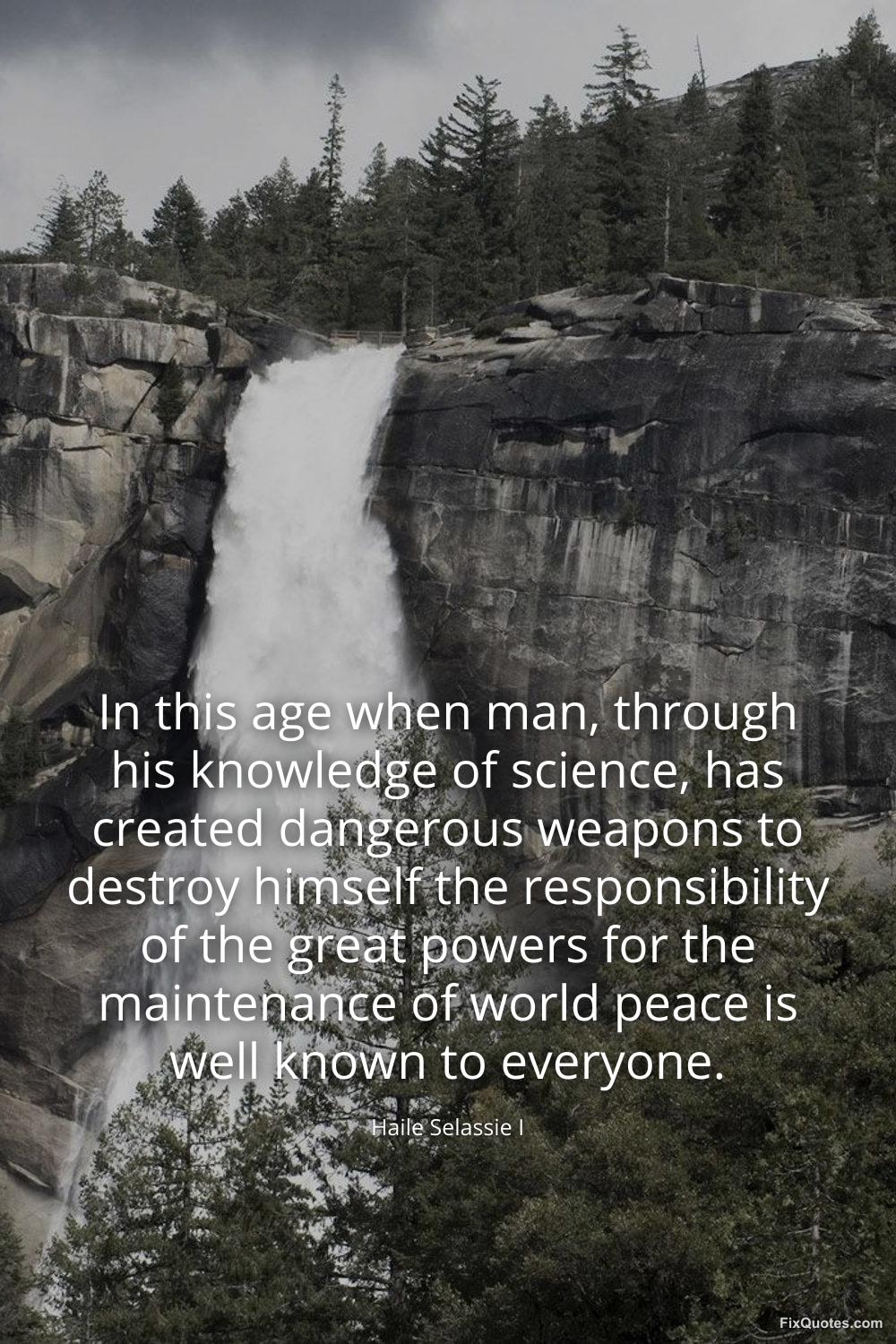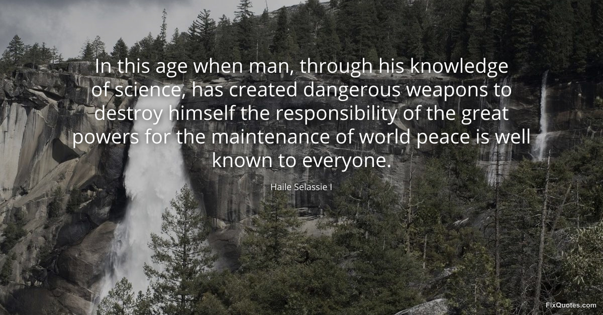 Selassie, Haile. (2026, March 17). In this age when man, through his knowledge of science, has created dangerous weapons to destroy himself the responsibility of the great powers for the maintenance of world peace is well known to everyone. FixQuotes. https://fixquotes.com/quotes/in-this-age-when-man-through-his-knowledge-of-186081/