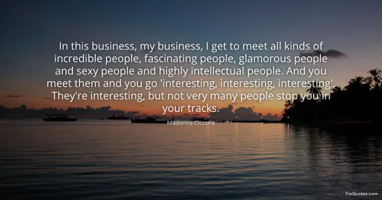 Ciccone, Madonna. "In this business, my business, I get to meet all kinds of incredible people, fascinating people, glamorous people and sexy people and highly intellectual people. And you meet them and you go 'interesting, interesting, interesting'. They're interesting, but not very many people stop you in your tracks." FixQuotes. January 15, 2026. https://fixquotes.com/quotes/in-this-business-my-business-i-get-to-meet-all-153784/.