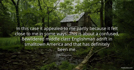 Firth, Colin. "In this case it appealed to me partly because it felt close to me in some ways. This is about a confused, bewildered middle class Englishman adrift in smalltown America and that has definitely been me." FixQuotes. January 17, 2026. https://fixquotes.com/quotes/in-this-case-it-appealed-to-me-partly-because-it-48143/.