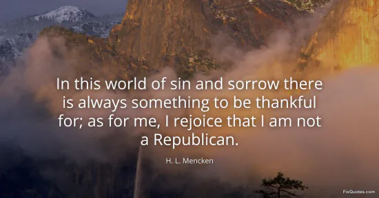 Mencken, H. L. "In this world of sin and sorrow there is always something to be thankful for; as for me, I rejoice that I am not a Republican." FixQuotes. January 18, 2026. https://fixquotes.com/quotes/in-this-world-of-sin-and-sorrow-there-is-always-19513/.