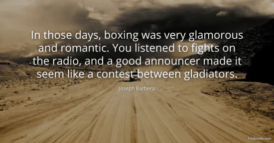 Barbera, Joseph. "In those days, boxing was very glamorous and romantic. You listened to fights on the radio, and a good announcer made it seem like a contest between gladiators." FixQuotes. January 17, 2026. https://fixquotes.com/quotes/in-those-days-boxing-was-very-glamorous-and-24247/.