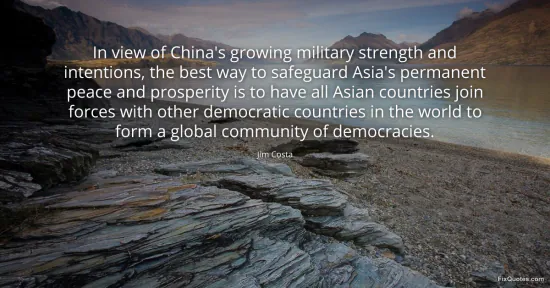 Costa, Jim. "In view of China's growing military strength and intentions, the best way to safeguard Asia's permanent peace and prosperity is to have all Asian countries join forces with other democratic countries in the world to form a global community of democracies." FixQuotes. January 15, 2026. https://fixquotes.com/quotes/in-view-of-chinas-growing-military-strength-and-146502/.