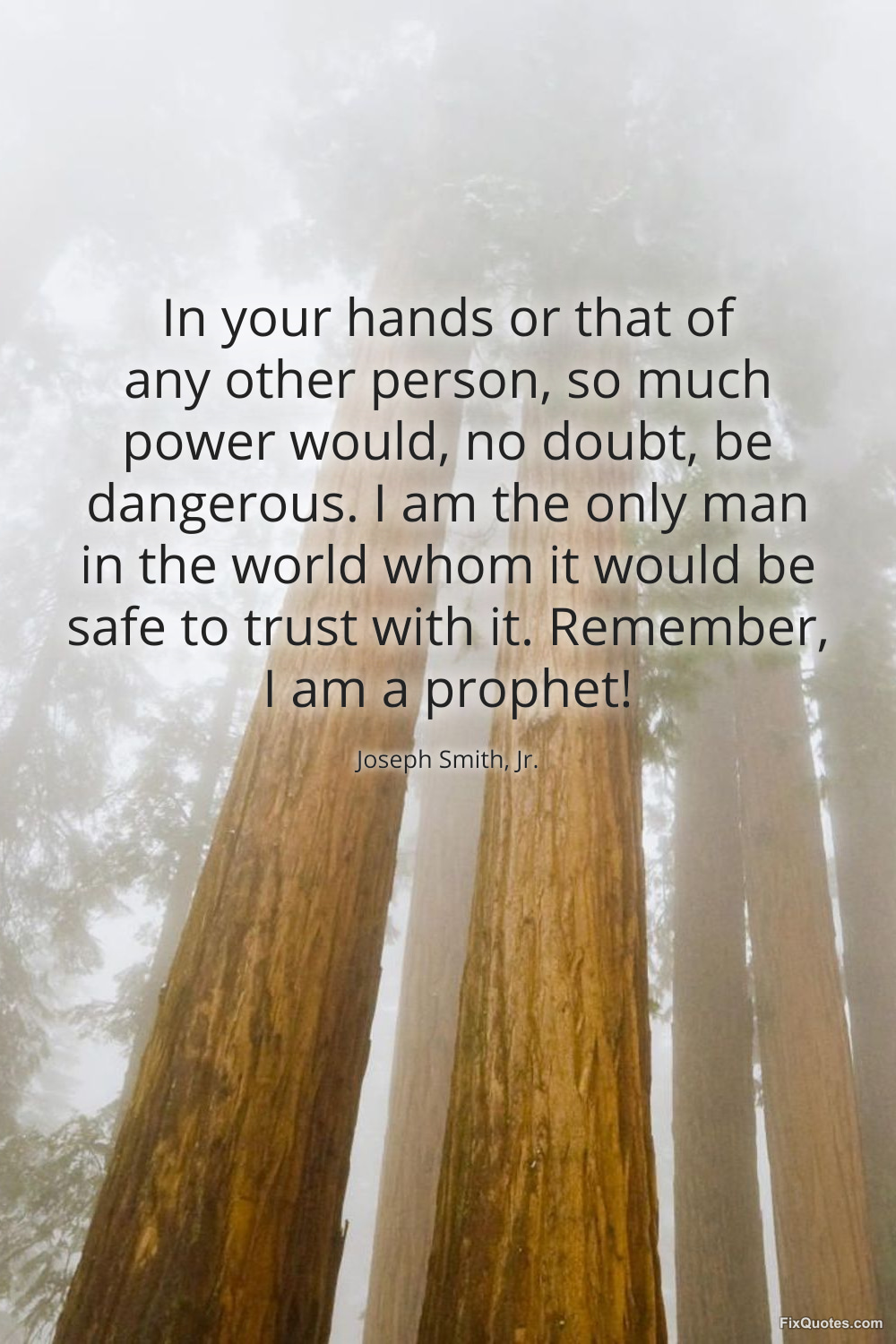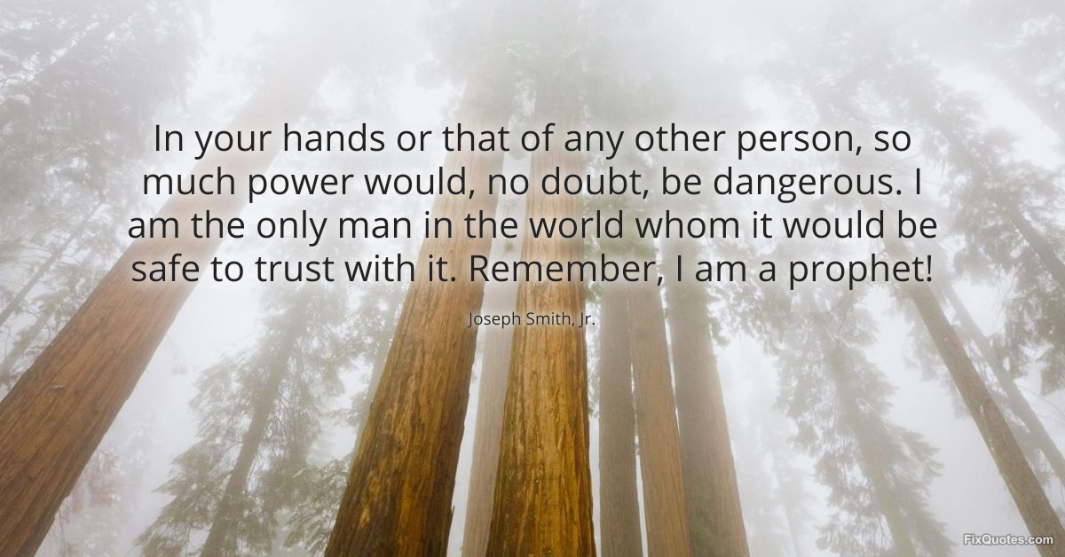 Jr., Joseph Smith,. "In your hands or that of any other person, so much power would, no doubt, be dangerous. I am the only man in the world whom it would be safe to trust with it. Remember, I am a prophet!" FixQuotes. January 17, 2026. https://fixquotes.com/quotes/in-your-hands-or-that-of-any-other-person-so-much-71716/.