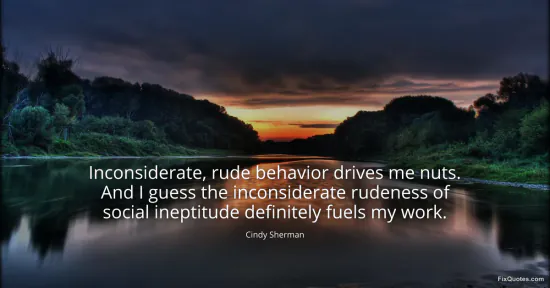 Sherman, Cindy. "Inconsiderate, rude behavior drives me nuts. And I guess the inconsiderate rudeness of social ineptitude definitely fuels my work." FixQuotes. January 17, 2026. https://fixquotes.com/quotes/inconsiderate-rude-behavior-drives-me-nuts-and-i-47608/.