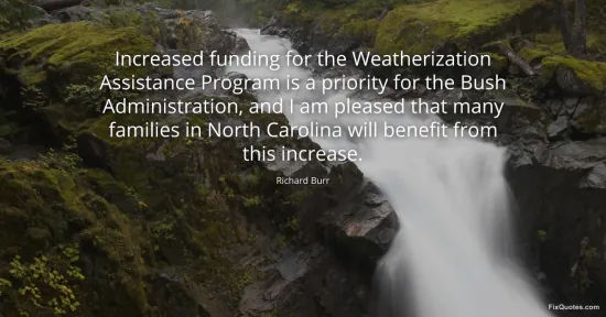 Burr, Richard. "Increased funding for the Weatherization Assistance Program is a priority for the Bush Administration, and I am pleased that many families in North Carolina will benefit from this increase." FixQuotes. January 16, 2026. https://fixquotes.com/quotes/increased-funding-for-the-weatherization-96868/.