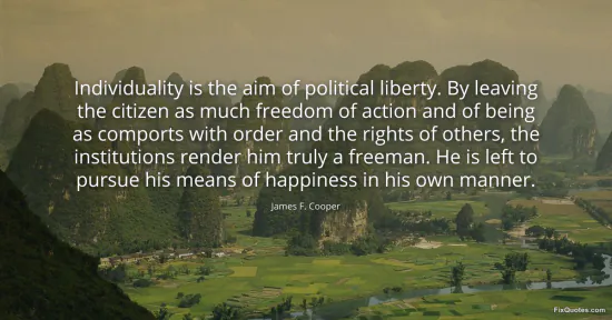 Cooper, James F. "Individuality is the aim of political liberty. By leaving the citizen as much freedom of action and of being as comports with order and the rights of others, the institutions render him truly a freeman. He is left to pursue his means of happiness in his own manner." FixQuotes. January 16, 2026. https://fixquotes.com/quotes/individuality-is-the-aim-of-political-liberty-by-85110/.