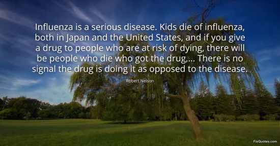 Nelson, Robert. (2026, January 17). Influenza is a serious disease. Kids die of influenza, both in Japan and the United States, and if you give a drug to people who are at risk of dying, there will be people who die who got the drug,... There is no signal the drug is doing it as opposed to the disease. FixQuotes. https://fixquotes.com/quotes/influenza-is-a-serious-disease-kids-die-of-81386/