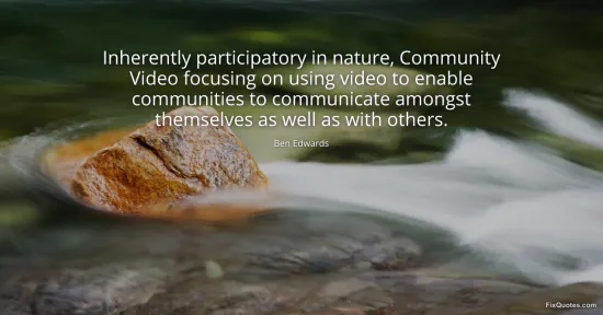 Edwards, Ben. "Inherently participatory in nature, Community Video focusing on using video to enable communities to communicate amongst themselves as well as with others." FixQuotes. January 17, 2026. https://fixquotes.com/quotes/inherently-participatory-in-nature-community-75597/.