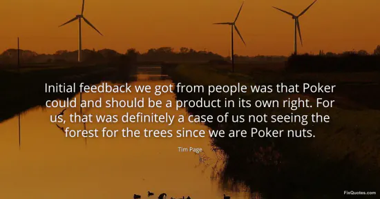 Page, Tim. "Initial feedback we got from people was that Poker could and should be a product in its own right. For us, that was definitely a case of us not seeing the forest for the trees since we are Poker nuts." FixQuotes. January 16, 2026. https://fixquotes.com/quotes/initial-feedback-we-got-from-people-was-that-133708/.
