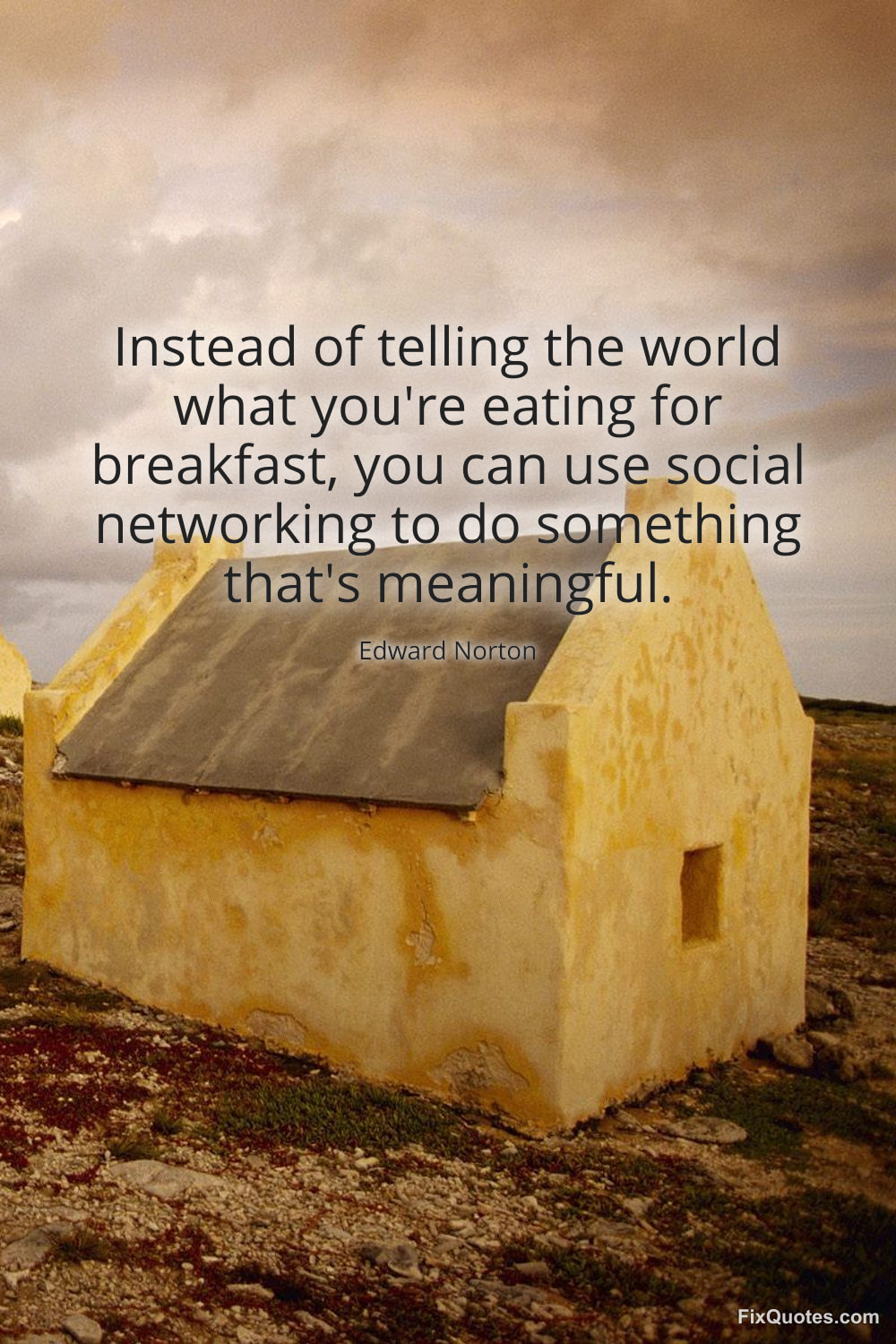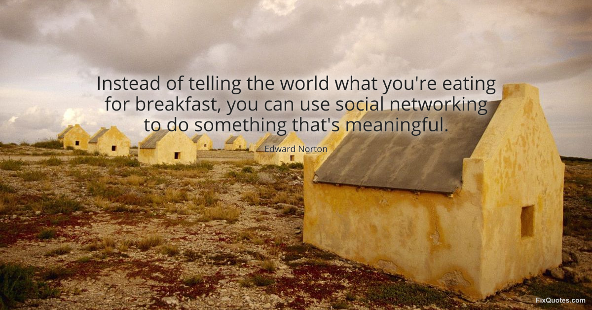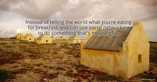 Norton, Edward. (2026, January 25). Instead of telling the world what you're eating for breakfast, you can use social networking to do something that's meaningful. FixQuotes. https://fixquotes.com/quotes/instead-of-telling-the-world-what-youre-eating-184325/