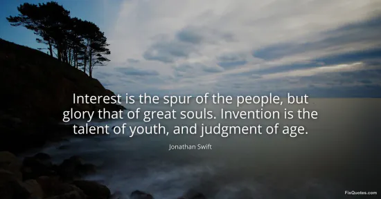 Swift, Jonathan. (2026, January 15). Interest is the spur of the people, but glory that of great souls. Invention is the talent of youth, and judgment of age. FixQuotes. https://fixquotes.com/quotes/interest-is-the-spur-of-the-people-but-glory-that-144220/
