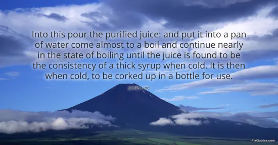 "Into this pour the purified juice: and put it into a pan of water come almost to a boil and continue nearly in the state of boiling until the juice is found to be the consistency of a thick syrup when cold. It is then when cold, to be corked up in a bottle for use." FixQuotes, 17 Jan. 2026, https://fixquotes.com/quotes/into-this-pour-the-purified-juice-and-put-it-into-63296/. Accessed 12 Feb. 2026.