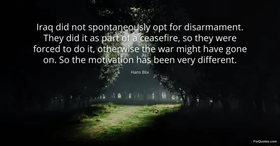 Blix, Hans. (2026, January 17). Iraq did not spontaneously opt for disarmament. They did it as part of a ceasefire, so they were forced to do it, otherwise the war might have gone on. So the motivation has been very different. FixQuotes. https://fixquotes.com/quotes/iraq-did-not-spontaneously-opt-for-disarmament-59759/