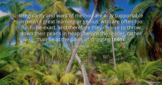 Addison, Joseph. "Irregularity and want of method are only supportable in men of great learning or genius, who are often too full to be exact, and therefore they choose to throw down their pearls in heaps before the reader, rather than be at the pains of stringing them." FixQuotes. January 17, 2026. https://fixquotes.com/quotes/irregularity-and-want-of-method-are-only-75223/.