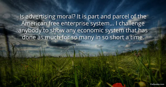 Hite, Morris. (2026, January 16). Is advertising moral? It is part and parcel of the American free enterprise system... I challenge anybody to show any economic system that has done as much for so many in so short a time. FixQuotes. https://fixquotes.com/quotes/is-advertising-moral-it-is-part-and-parcel-of-the-120396/