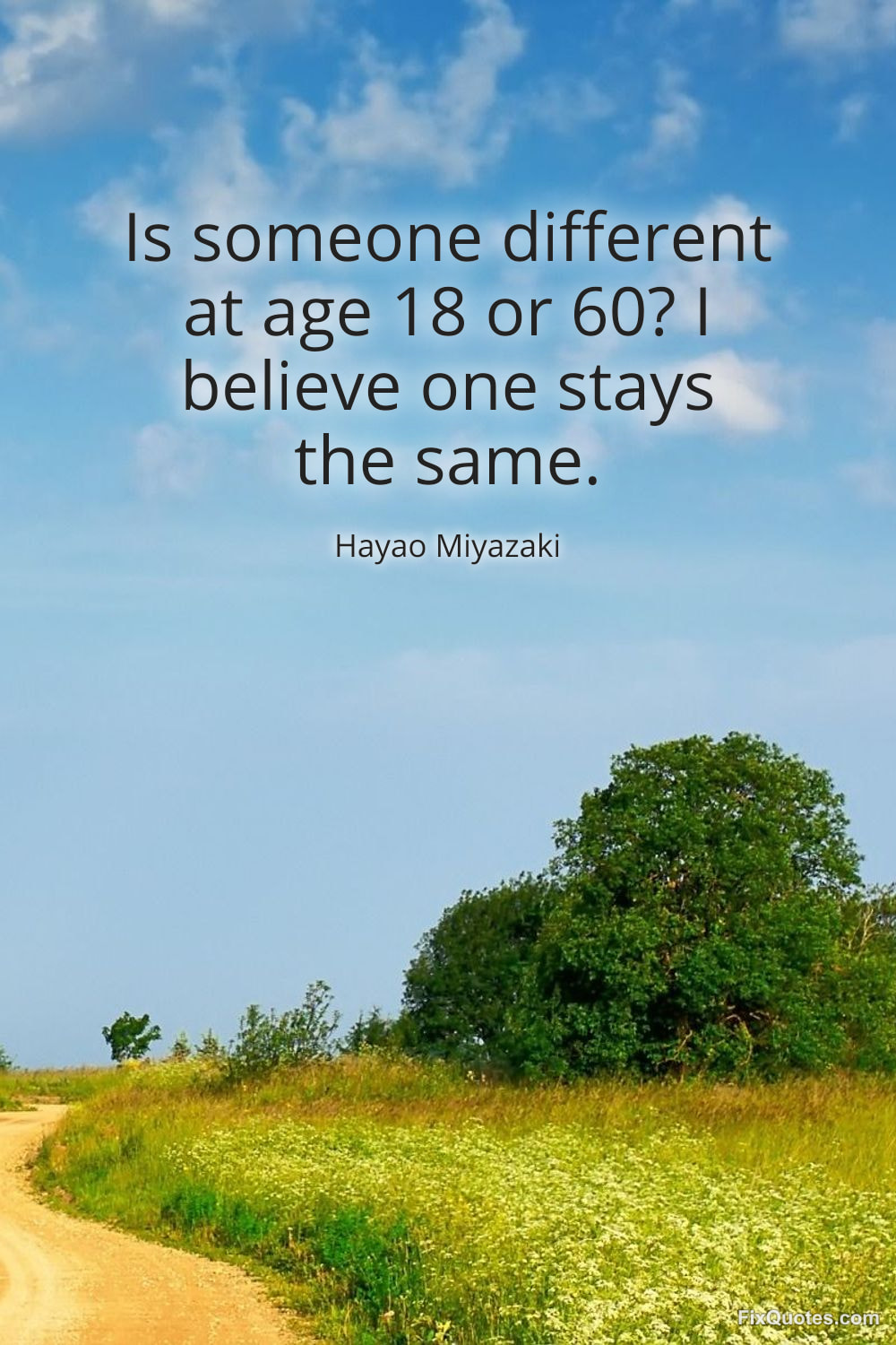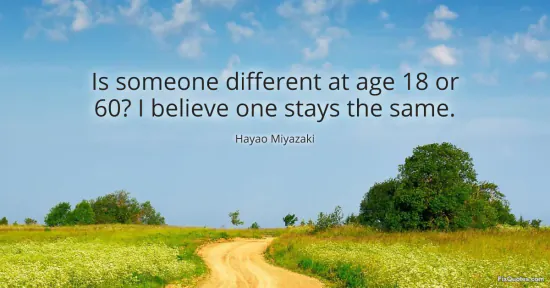 Miyazaki, Hayao. (2026, February 9). Is someone different at age 18 or 60? I believe one stays the same. FixQuotes. https://fixquotes.com/quotes/is-someone-different-at-age-18-or-60-i-believe-71857/