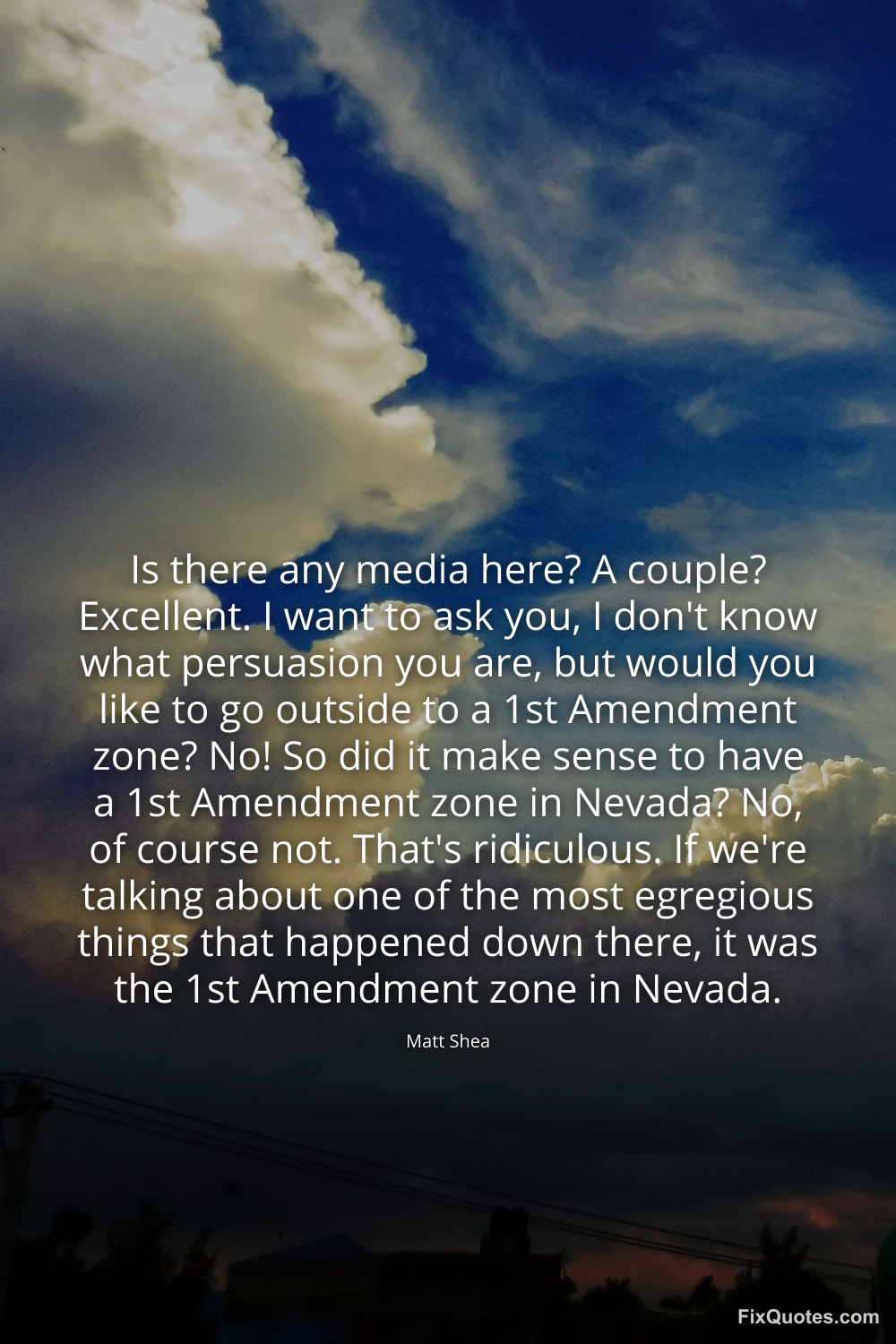 Shea, Matt. "Is there any media here? A couple? Excellent. I want to ask you, I don't know what persuasion you are, but would you like to go outside to a 1st Amendment zone? No! So did it make sense to have a 1st Amendment zone in Nevada? No, of course not. That's ridiculous. If we're talking about one of the most egregious things that happened down there, it was the 1st Amendment zone in Nevada." FixQuotes. February 9, 2026. https://fixquotes.com/quotes/is-there-any-media-here-a-couple-excellent-i-want-184992/.
