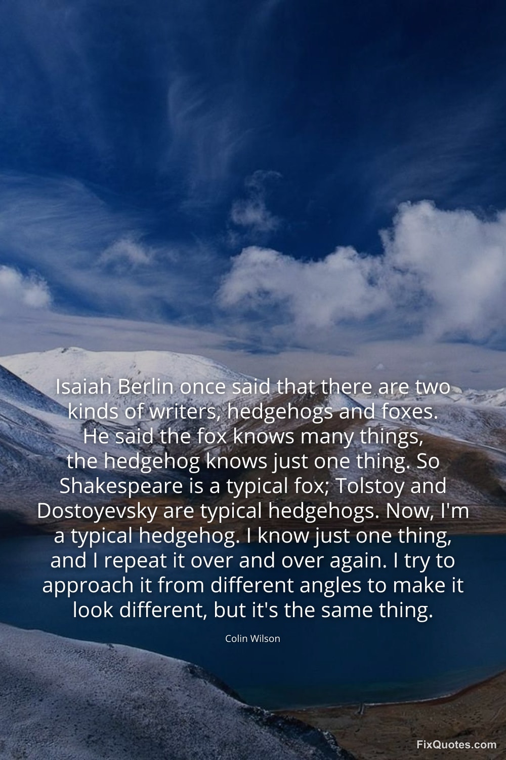 Wilson, Colin. "Isaiah Berlin once said that there are two kinds of writers, hedgehogs and foxes. He said the fox knows many things, the hedgehog knows just one thing. So Shakespeare is a typical fox; Tolstoy and Dostoyevsky are typical hedgehogs. Now, I'm a typical hedgehog. I know just one thing, and I repeat it over and over again. I try to approach it from different angles to make it look different, but it's the same thing." FixQuotes. January 15, 2026. https://fixquotes.com/quotes/isaiah-berlin-once-said-that-there-are-two-kinds-173521/.