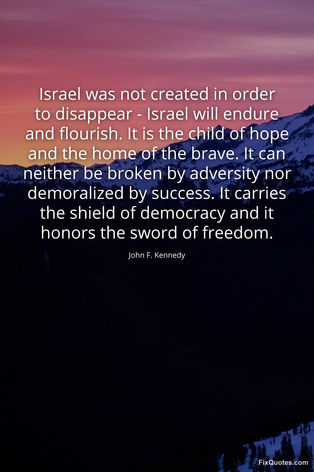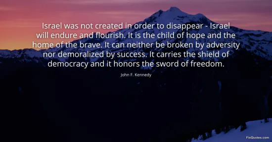 Kennedy, John F. (2026, February 12). Israel was not created in order to disappear - Israel will endure and flourish. It is the child of hope and the home of the brave. It can neither be broken by adversity nor demoralized by success. It carries the shield of democracy and it honors the sword of freedom. FixQuotes. https://fixquotes.com/quotes/israel-was-not-created-in-order-to-disappear-41393/