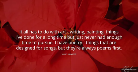 Newsted, Jason. "It all has to do with art - writing, painting, things I've done for a long time but just never had enough time to pursue. I have poetry - things that are designed for songs, but they're always poems first." FixQuotes. January 16, 2026. https://fixquotes.com/quotes/it-all-has-to-do-with-art-writing-painting-119501/.