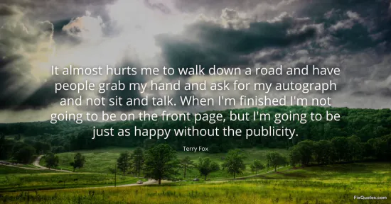 Fox, Terry. "It almost hurts me to walk down a road and have people grab my hand and ask for my autograph and not sit and talk. When I'm finished I'm not going to be on the front page, but I'm going to be just as happy without the publicity." FixQuotes. January 16, 2026. https://fixquotes.com/quotes/it-almost-hurts-me-to-walk-down-a-road-and-have-129485/.