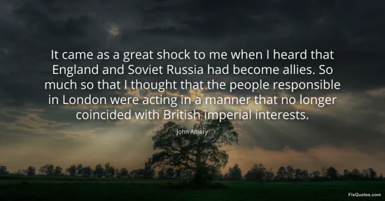 Amery, John. "It came as a great shock to me when I heard that England and Soviet Russia had become allies. So much so that I thought that the people responsible in London were acting in a manner that no longer coincided with British imperial interests." FixQuotes. January 17, 2026. https://fixquotes.com/quotes/it-came-as-a-great-shock-to-me-when-i-heard-that-46944/.