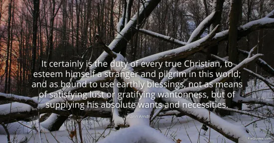 Arndt, Johann. (2026, January 18). It certainly is the duty of every true Christian, to esteem himself a stranger and pilgrim in this world; and as bound to use earthly blessings, not as means of satisfying lust or gratifying wantonness, but of supplying his absolute wants and necessities. FixQuotes. https://fixquotes.com/quotes/it-certainly-is-the-duty-of-every-true-christian-3062/