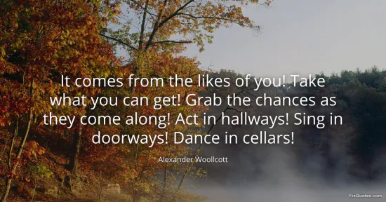 Woollcott, Alexander. (2026, January 15). It comes from the likes of you! Take what you can get! Grab the chances as they come along! Act in hallways! Sing in doorways! Dance in cellars! FixQuotes. https://fixquotes.com/quotes/it-comes-from-the-likes-of-you-take-what-you-can-43891/