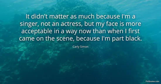 Simon, Carly. "It didn't matter as much because I'm a singer, not an actress, but my face is more acceptable in a way now than when I first came on the scene, because I'm part black." FixQuotes. January 17, 2026. https://fixquotes.com/quotes/it-didnt-matter-as-much-because-im-a-singer-not-72462/.