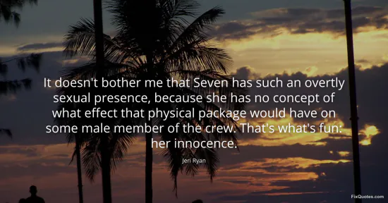 Ryan, Jeri. (2026, February 16). It doesn't bother me that Seven has such an overtly sexual presence, because she has no concept of what effect that physical package would have on some male member of the crew. That's what's fun: her innocence. FixQuotes. https://fixquotes.com/quotes/it-doesnt-bother-me-that-seven-has-such-an-142917/