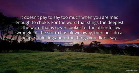 Renard, Jules. (2026, January 17). It doesn't pay to say too much when you are mad enough to choke. For the word that stings the deepest is the word that is never spoke, Let the other fellow wrangle till the storm has blown away, then he'll do a heap of thinking about the things you didn't say. FixQuotes. https://fixquotes.com/quotes/it-doesnt-pay-to-say-too-much-when-you-are-mad-47148/