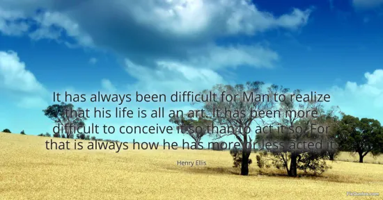 Ellis, Henry. "It has always been difficult for Man to realize that his life is all an art. It has been more difficult to conceive it so than to act it so. For that is always how he has more or less acted it." FixQuotes. January 18, 2026. https://fixquotes.com/quotes/it-has-always-been-difficult-for-man-to-realize-5331/.