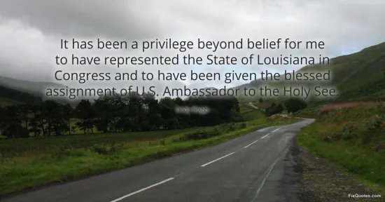 "It has been a privilege beyond belief for me to have represented the State of Louisiana in Congress and to have been given the blessed assignment of U.S. Ambassador to the Holy See." FixQuotes, 17 Jan. 2026, https://fixquotes.com/quotes/it-has-been-a-privilege-beyond-belief-for-me-to-74462/. Accessed 21 Feb. 2026.