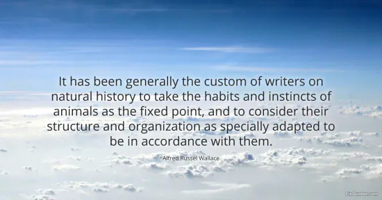Wallace, Alfred Russel. "It has been generally the custom of writers on natural history to take the habits and instincts of animals as the fixed point, and to consider their structure and organization as specially adapted to be in accordance with them." FixQuotes. January 16, 2026. https://fixquotes.com/quotes/it-has-been-generally-the-custom-of-writers-on-138248/.