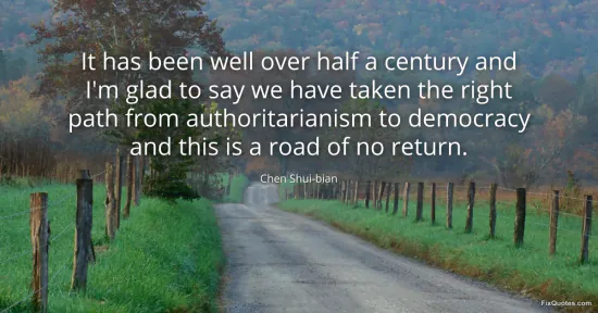 Shui-bian, Chen. (2026, January 17). It has been well over half a century and I'm glad to say we have taken the right path from authoritarianism to democracy and this is a road of no return. FixQuotes. https://fixquotes.com/quotes/it-has-been-well-over-half-a-century-and-im-glad-43241/