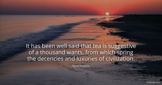 Repplier, Agnes. (2026, January 15). It has been well said that tea is suggestive of a thousand wants, from which spring the decencies and luxuries of civilization. FixQuotes. https://fixquotes.com/quotes/it-has-been-well-said-that-tea-is-suggestive-of-a-39091/