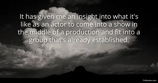 Nemec, Corin. "It has given me an insight into what it's like as an actor to come into a show in the middle of a production and fit into a group that's already established." FixQuotes. January 17, 2026. https://fixquotes.com/quotes/it-has-given-me-an-insight-into-what-its-like-as-44091/.