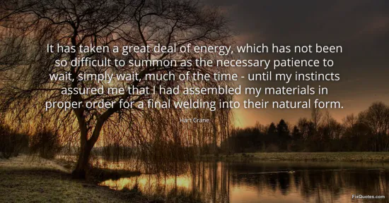 Crane, Hart. "It has taken a great deal of energy, which has not been so difficult to summon as the necessary patience to wait, simply wait, much of the time - until my instincts assured me that I had assembled my materials in proper order for a final welding into their natural form." FixQuotes. February 16, 2026. https://fixquotes.com/quotes/it-has-taken-a-great-deal-of-energy-which-has-not-158408/.