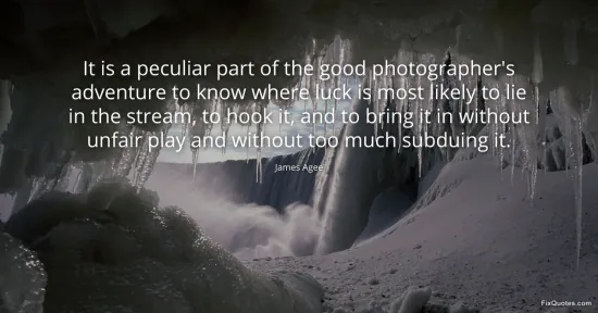 Agee, James. (2026, January 17). It is a peculiar part of the good photographer's adventure to know where luck is most likely to lie in the stream, to hook it, and to bring it in without unfair play and without too much subduing it. FixQuotes. https://fixquotes.com/quotes/it-is-a-peculiar-part-of-the-good-photographers-65148/