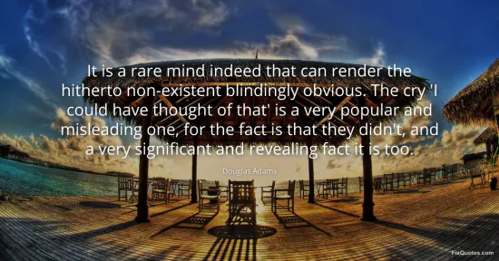 Adams, Douglas. "It is a rare mind indeed that can render the hitherto non-existent blindingly obvious. The cry 'I could have thought of that' is a very popular and misleading one, for the fact is that they didn't, and a very significant and revealing fact it is too." FixQuotes. January 15, 2026. https://fixquotes.com/quotes/it-is-a-rare-mind-indeed-that-can-render-the-30871/.