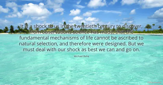 Behe, Michael. "It is a shock to us in the twentieth century to discover, from observations science has made, that the fundamental mechanisms of life cannot be ascribed to natural selection, and therefore were designed. But we must deal with our shock as best we can and go on." FixQuotes. January 17, 2026. https://fixquotes.com/quotes/it-is-a-shock-to-us-in-the-twentieth-century-to-56807/.